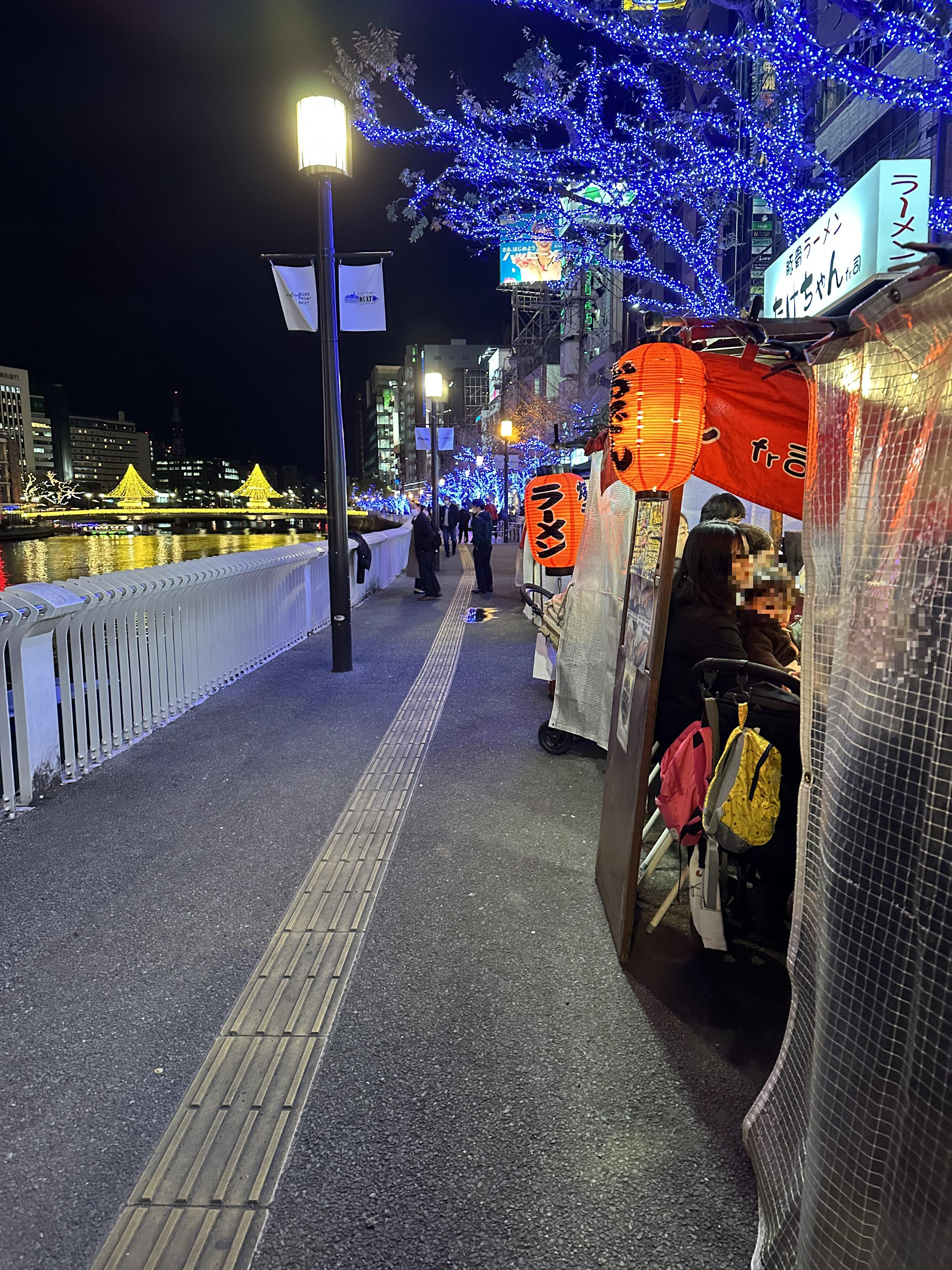 숙소 앞으로 나가면 이렇게 나카 강이 흐르고 있고 저 멀리 반짝이는 나무가 있는 거리가 바로 포장마차 거리입니다.